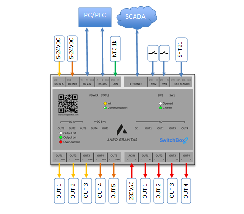 A SWITCH BOX 2 egy ipari kapcsoló és vezérlő egység, amely AC és DC fogyasztók távoli vezérlésére és felügyeletére szolgál. A készülék több ipari kommunikációs interfésszel rendelkezik, így könnyen integrálható SCADA, PLC vagy IoT rendszerekbe. Az eszköz lehetővé teszi berendezések távoli vezérlését, felügyeletét és szenzorok integrálását ipari és infrastruktúra környezetben.